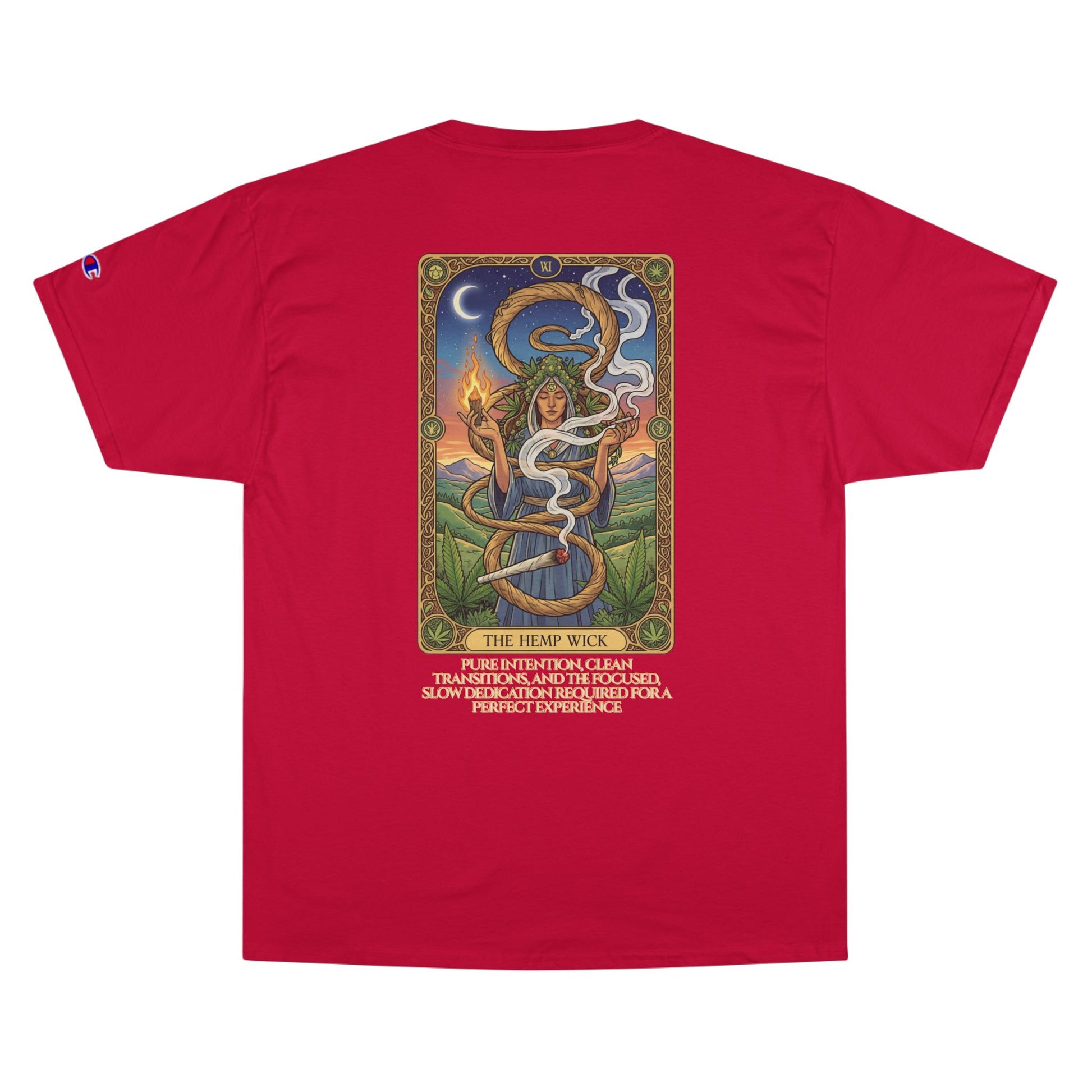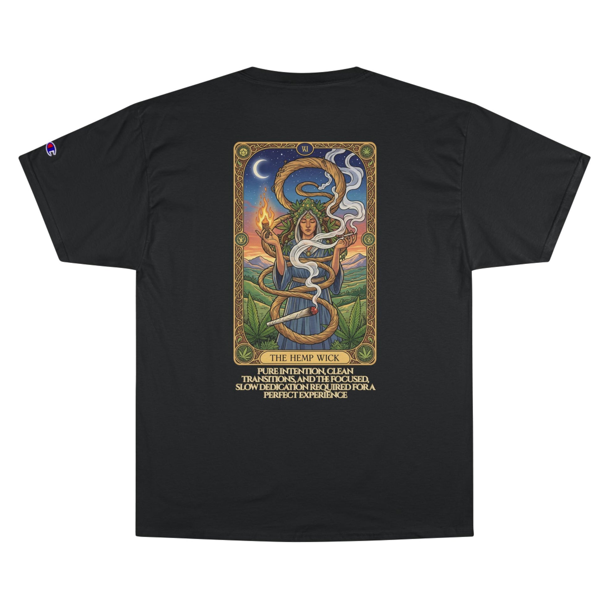 A Champion T-Shirt featuring the hemp wick tarot design for cannabis lovers. This t-shirt gives off a relaxed and chill vibe, perfect for casual wear or lounging around. Ideal for adults who enjoy cannabis and tarot themes. Relevant for 420 celebrations and everyday wear.